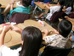 クラフト紙をねじって耳を作る2年生