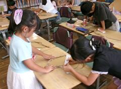 クラフト紙が付くまで押さえる2年生
