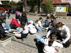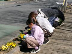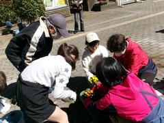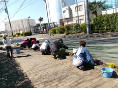 園芸教室参加者と育成会の皆さんで花壇の草取り