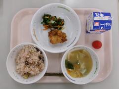 お赤飯・鶏のから揚げ・のり和え・みそ汁・いちご