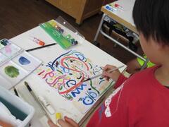 絵の具で「なぞのしま」を描く3年生