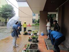 雨を気にせず花壇に花を植える育成会の皆さん
