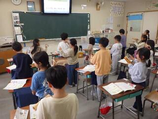 1年生生活科「きせつとなかよし」で保育園児を呼んで行うあきまつりのリハーサルを行いました。他のクラスをまわり、店番をすることで当日のイメージがわきました。今日のリハーサルを振り返り、当日に向けて最後の詰めを頑張ろうと、子ども達も気合が入っています。