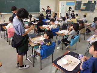 本日より、1年生の給食が始まりました。始めての給食に少し緊張した様子も見られましたが、6年生が牛乳パックの開き方や食器の片付け方を優しく教える姿があり、温かい雰囲気の中でスタートすることができました。1年生は意欲的に食事を進め、「おかわり」をする姿も多く見られました。これからの給食の時間が楽しみです。(大熊)