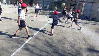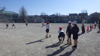 風はまだまだ冷たいですが、抜けるような青空のもと、元気いっぱいに体育の授業を頑張っている2年生と4年生!!