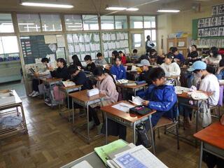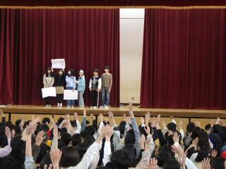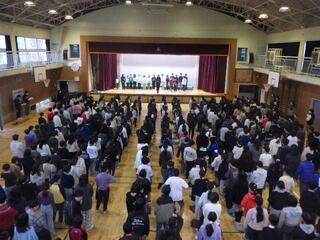 3学年が集まって行われた集会は、大いに盛り上がりました。(笹田)