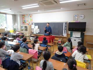 落語家の 天家 燈四郎(あまや とうしろう)さん 1年生5クラス、4年生1クラス、合計6クラスに楽しいお話をしてくださいました。