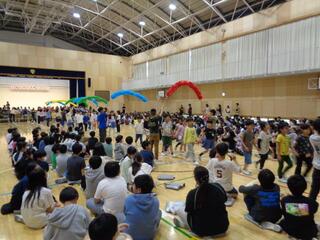 1年生と6年生が手をつないで、花のアーチをくぐって入場