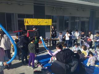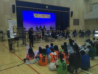 ひばりが丘中学校吹奏楽部による演奏から始まり、校庭でも体育館でも大いに盛り上がり、子どもたちのたくさんの笑顔と喜びの声を聞くことができました。