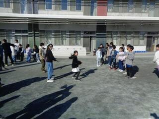 本校の特徴の一つ、縦割り活動「ペア交流」です。今日は、2年生と4年生が一緒に校庭で長縄をしました。