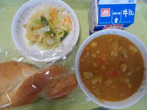 ミルクパン、ひよこ豆のカレーシチュー、グリーンサラダ、牛乳