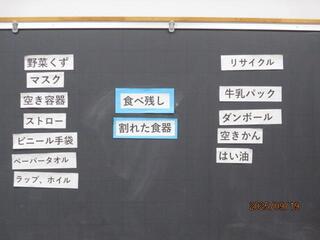 17日と本日19日の2日に分けて、社会の時間に、4年生対象に給食室から出るごみについて、栄養士と担任でお話しをしました。色々なごみが出る中で、食べ残しや割れた食器は、自分たちの努力次第で、減らせるごみであることに気が付いたようです。リサイクルできるものは、燃やすごみとは分別することも伝えました。今日は栄養や味付けの観点からではなく、ごみという視点から、給食を見つめ直していくことの大切さを確認しました。