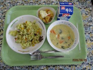9月25日(水曜日)カレーカラフルライス・野菜とポテトのマヨネーズ焼き・豆乳コーンチャウダー・牛乳