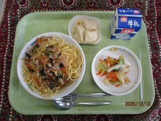 12月10日(水曜日)スパゲッティきのこソース・グリーンサラダ・さつまいも蒸しパン・牛乳