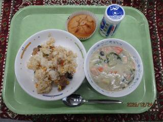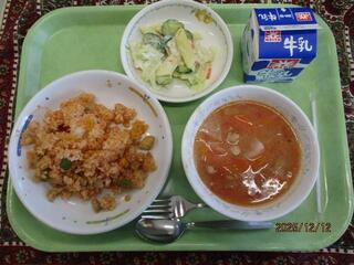 12月15日(月曜日)小松菜チャーハン・キムチチゲ・グレープゼリー・牛乳
