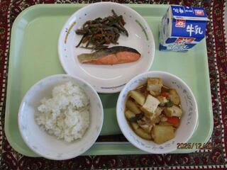 12月16日(火曜日) ごはん・鮭の塩焼き・茎わかめとツナのきんぴら・豚肉とじゃがいものうま煮・牛乳