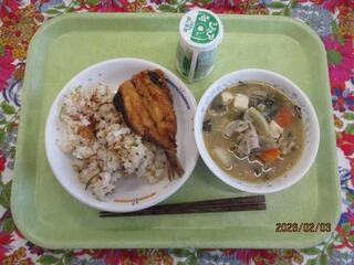 2月3日(火曜日)梅めかぶごはん、いわしのから揚げ、豆豚汁・発酵乳(白ぶどう)