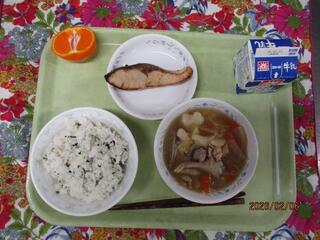 2月6日(金曜日)わかめごはん・ぶりの照り焼き・すいとん汁・くだもの(みかん)・牛乳
