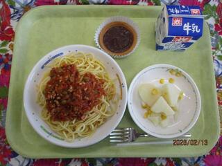 2月13日(金曜日)スパゲッティミートソース・コーンポテト・チョコレートチーズタルト・牛乳