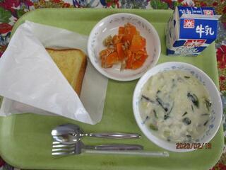 2月18日(水曜日) はちみつレモントースト・鮭とほうれん草のクリームシチュー・にんじんサラダ・牛乳