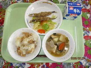 2月24日(火曜日) 沢庵と油揚げの混ぜごはん・ししゃものごま焼き・ゆで野菜の中華漬け・田舎汁 牛乳