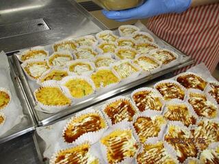 今日は玉ねぎをたくさん使って、ミートソースを作りました。ミートソースの味は、玉ねぎをよく炒めたかどうかが決め手になります。給食室では玉ねぎを朝からよく炒め、調味料とともに、時間をかけて煮込みました。ケチャップを多めにした今日の味付けはよかったそうです。また、チョコレートチーズタルトも人気でよく食べていました。「給食室からの愛は届きましたか」の問いに対して、どのクラスからも元気に「はい!」と返ってきたものの、食べる方に夢中になっている様子が伝わってきました。