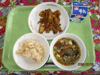 2月26日(木曜日) にんじんごはん・揚げじゃがいものそぼろ煮・もずく汁・牛乳