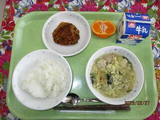 2月27日(金曜日) ごはん・キャベツ入りメンチカツ・ABCスープ・くだもの(みかん)・牛乳