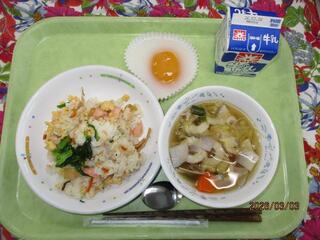 3月3日(火曜日)菜の花と鮭のちらし寿司・野菜と白玉餅の団子汁・おかしな目玉焼き・牛乳