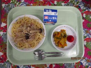 3月4日(水曜日)和風スープスパゲッティ・かぼちゃとさつまいものサラダ・くだもの(いちご)・牛乳