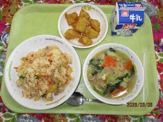 3月6日(金曜日)キムチチャーハン・味噌ポテト・野菜たっぷりスープ・牛乳