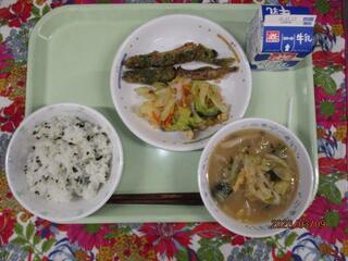 3月9日(月曜日) わかめごはん・ししゃもの磯辺揚げ・糸寒天のごま酢あえ・野菜たっぷりみそ汁・牛乳