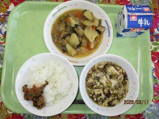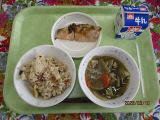 3月10日(火曜日)赤米入り栗ご飯・ますのしそみそ焼き・縄文鍋・牛乳