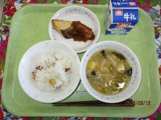 3月12日(木曜日) カリカリさつまいもごはん・ぶりの照り焼き甘辛ソース・具沢山みそ汁・牛乳