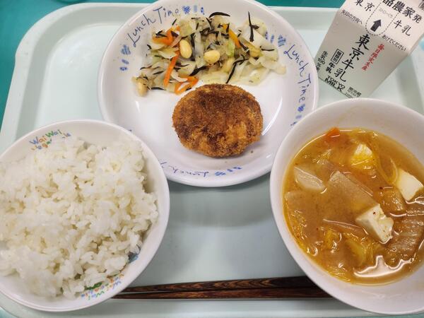 ごはん コロッケ 満点サラダ キムチスープ 東京牛乳