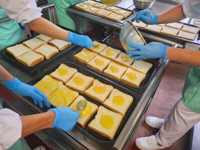 食パンにはちみつ、砂糖、マーガリンを塗ってこんがりと焼き上げます。