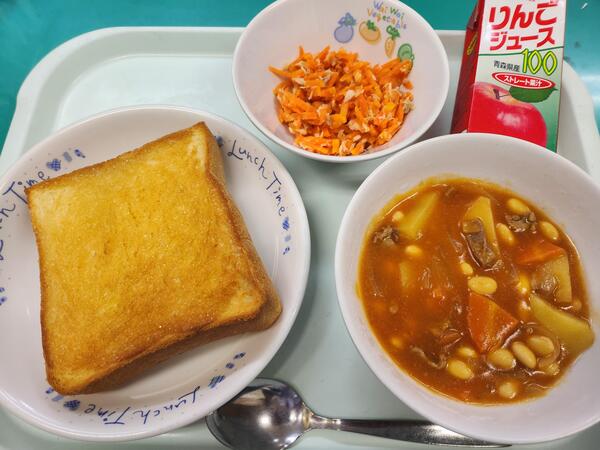 ハニートースト ポークビーンズ にんじんサラダ りんごジュース
