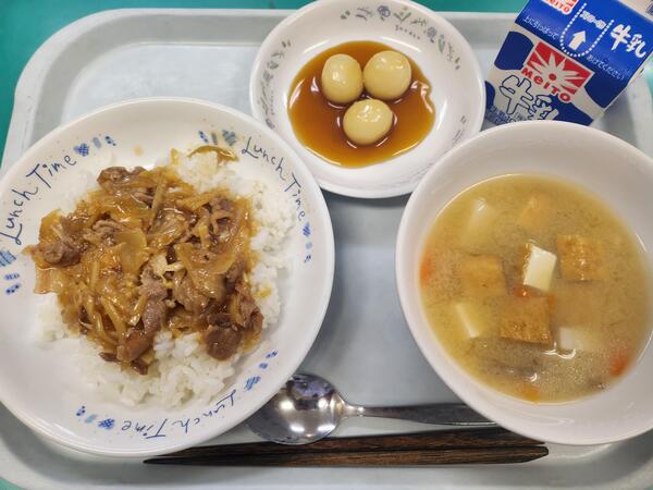 豚肉のしぐれ煮丼 里芋の田舎汁 お月見みたらし団子 牛乳