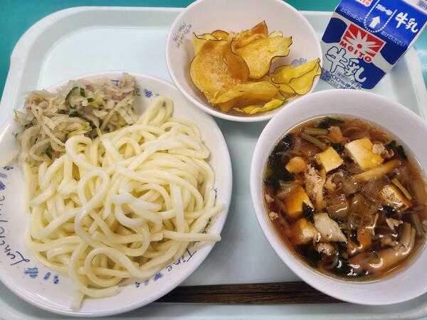 豚すきうどん さつまいもチップス 切り干し大根のナムル 牛乳