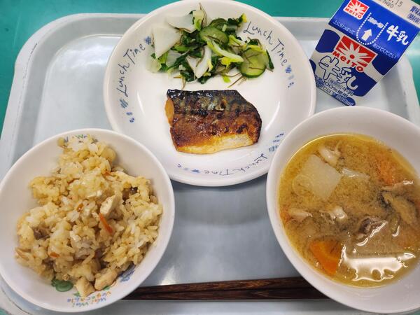 豆腐めし さばの西京焼き 野菜の浅漬け こしね汁 牛乳