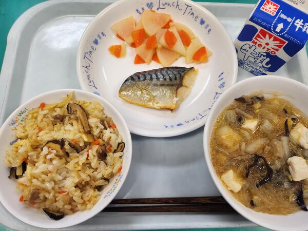 中華おこわ さば文化干し かぶの華風漬け 豆腐ときくらげのスープ 牛乳
