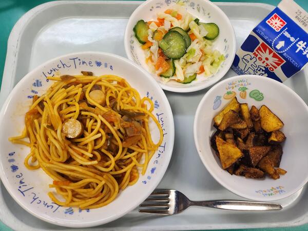 スパゲティナポリタン シナモンポテト フレンチサラダ 牛乳