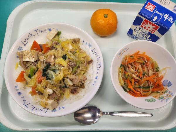 きゃべすき丼 春雨サラダ みかん 牛乳
