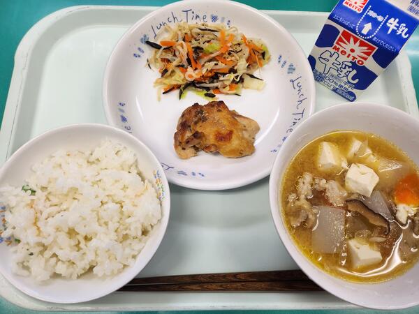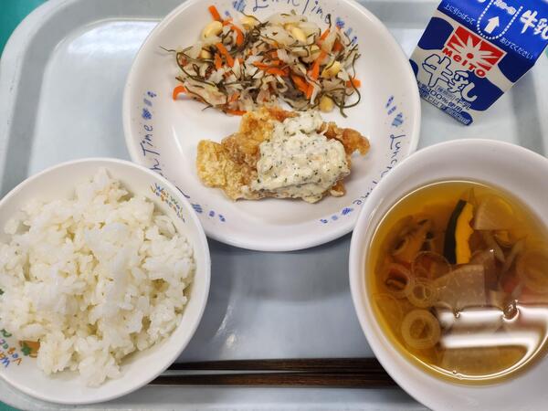 ごはん チキン南蛮 まだか漬け ざぶ汁 牛乳