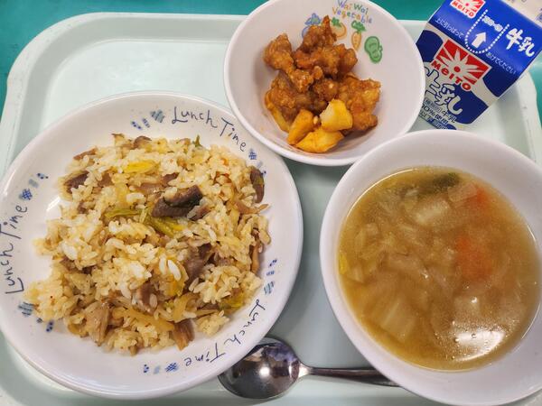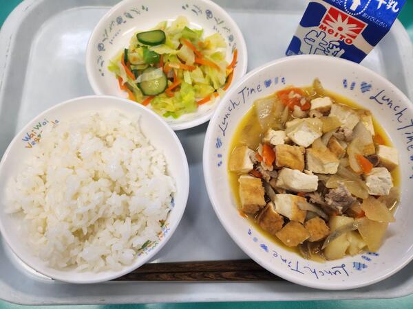 キムタクごはん 鶏肉とじゃがいもの揚げ煮 白菜の中華スープ 牛乳