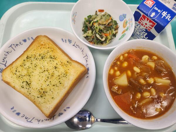 ガーリックトースト ポークビーンズ だいこんサラダ 牛乳