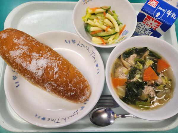 シュガー揚げパン 肉団子スープ マカロニサラダ 牛乳