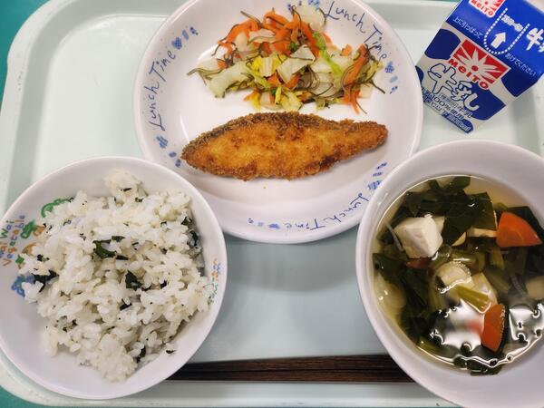 わかめごはん サーモンフライ 昆布白菜 すまし汁 牛乳