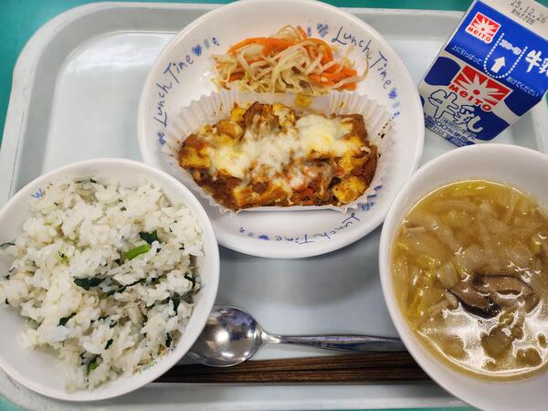ちりめん菜飯 生揚げのチーズ焼き もやしのナムル きのこのスープ 牛乳