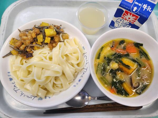 ほうとううどん 大豆と小魚の揚げ煮 さわやかゆずゼリー 牛乳